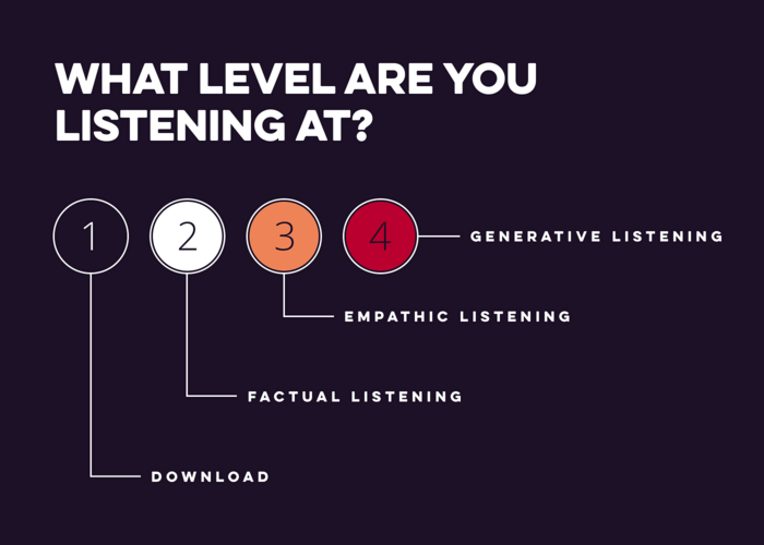 Otto Scharmer, senior lecturer at MIT, describes four levels of listening: downloading, factual, empathic and generative. By focusing on listening, Scharmer wants us to open our mind, heart and will in a balanced and holistic way. At level one, downloading, listening is limited and reconfirms what we already know. Nothing new emerges in our mind. We listen to our own inner voice and thoughts. We are not really present. Our minds are occupied elsewhere.